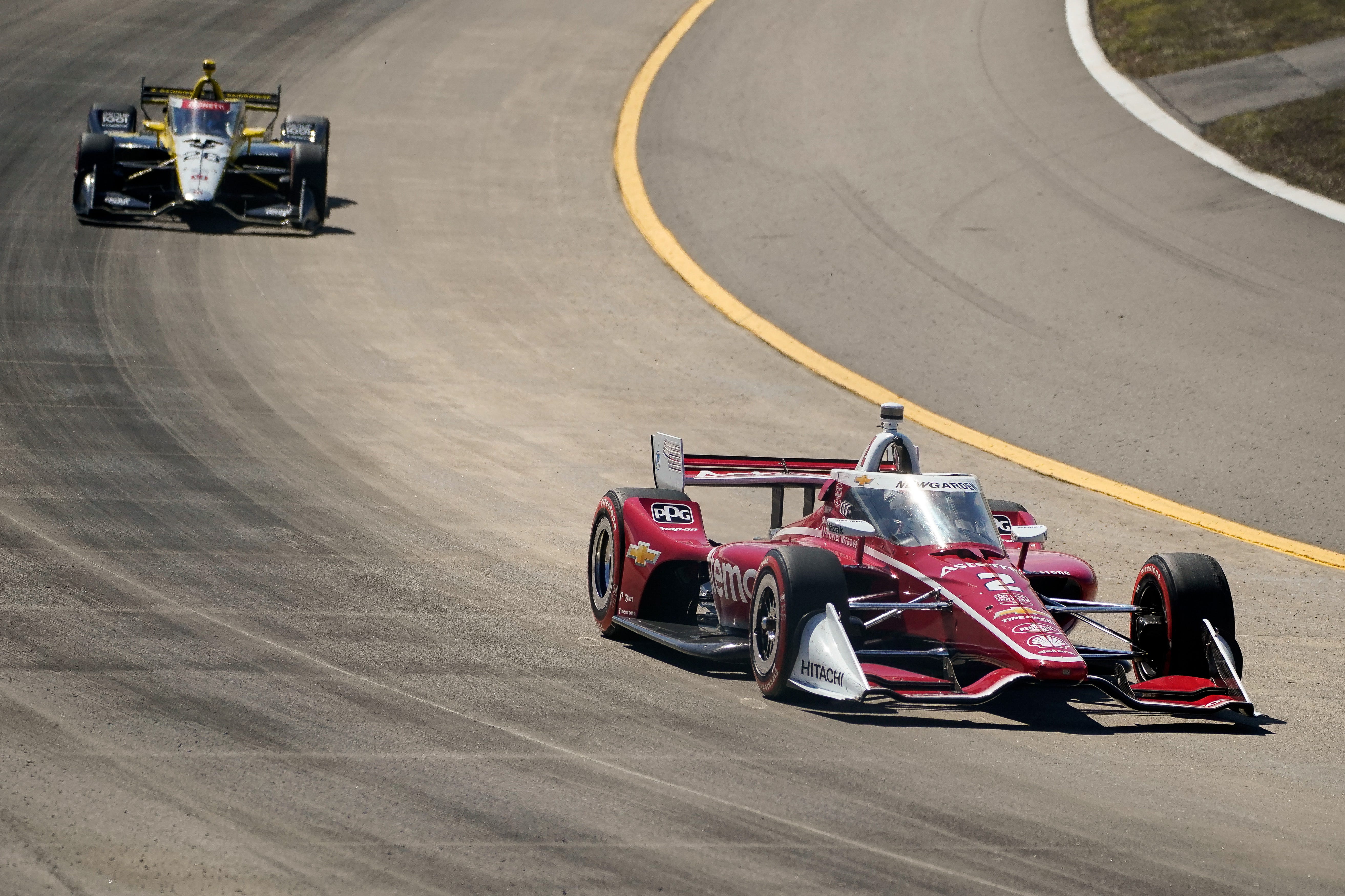 Will Power moves past Colton Herta for second. Three Penske cars in the top six.